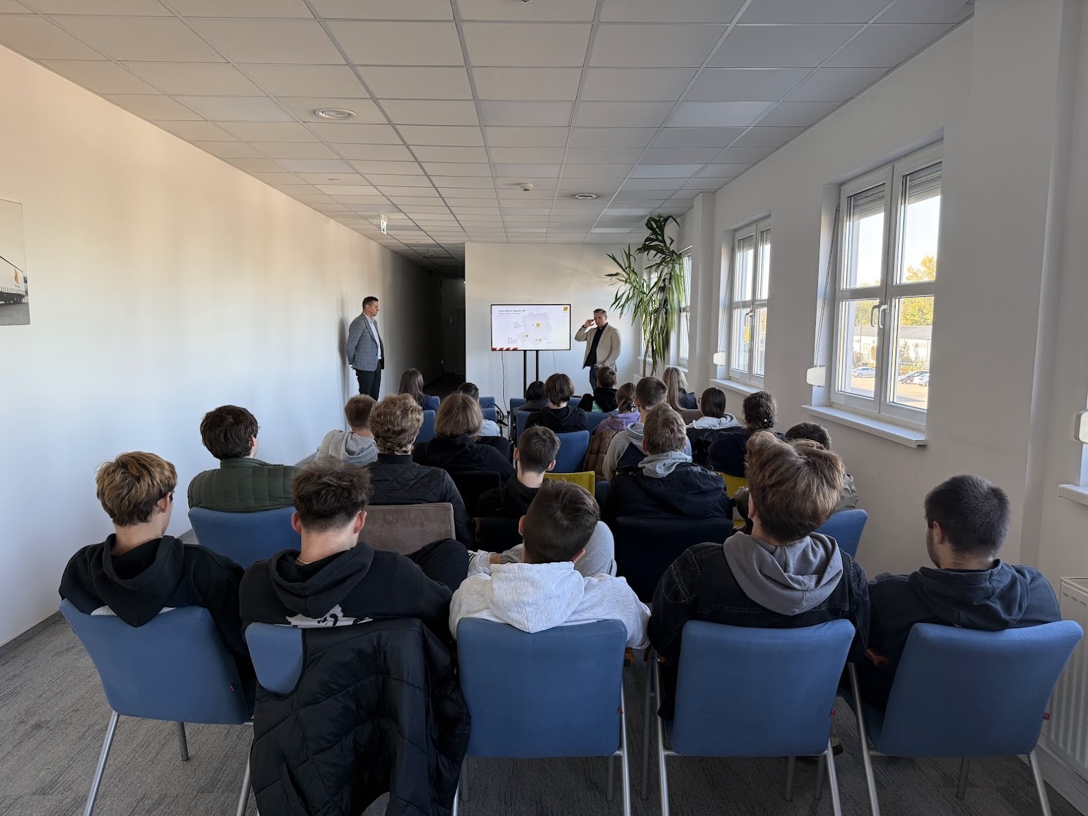 Wizyta rozpoczęła się od powitania uczestników przez przedstawicieli firmy – dyrektora Oddziału w Grodzisku Mazowieckim Pana Patryka Dynowskiego oraz Pana Rafał Augustyniak – dyrektor Oddziału w Strykowie, którzy zapoznali grupę z historią i profilem działalności Grupy Geis. Przedstawili strukturę i zakres działalności Grupy w Polsce i Europie, profil usług logistycznych oraz znaczenie oddziału w Grodzisku Mazowieckim w strukturze operacyjnej firmy. Uczestnicy mieli również okazję poznać możliwości rozwoju zawodowego w organizacji, w tym politykę odbywania staży i praktyk w organizacji.
